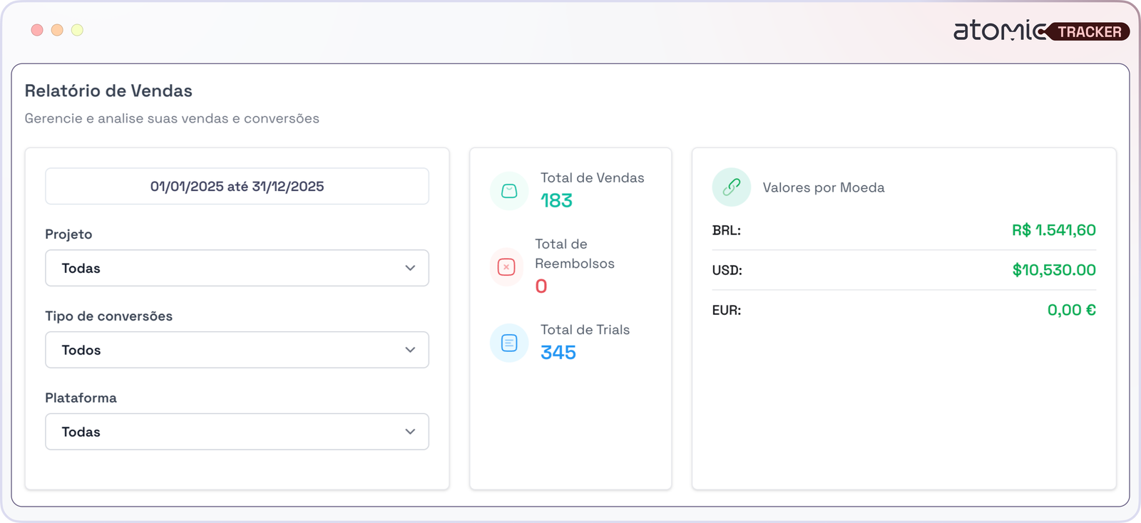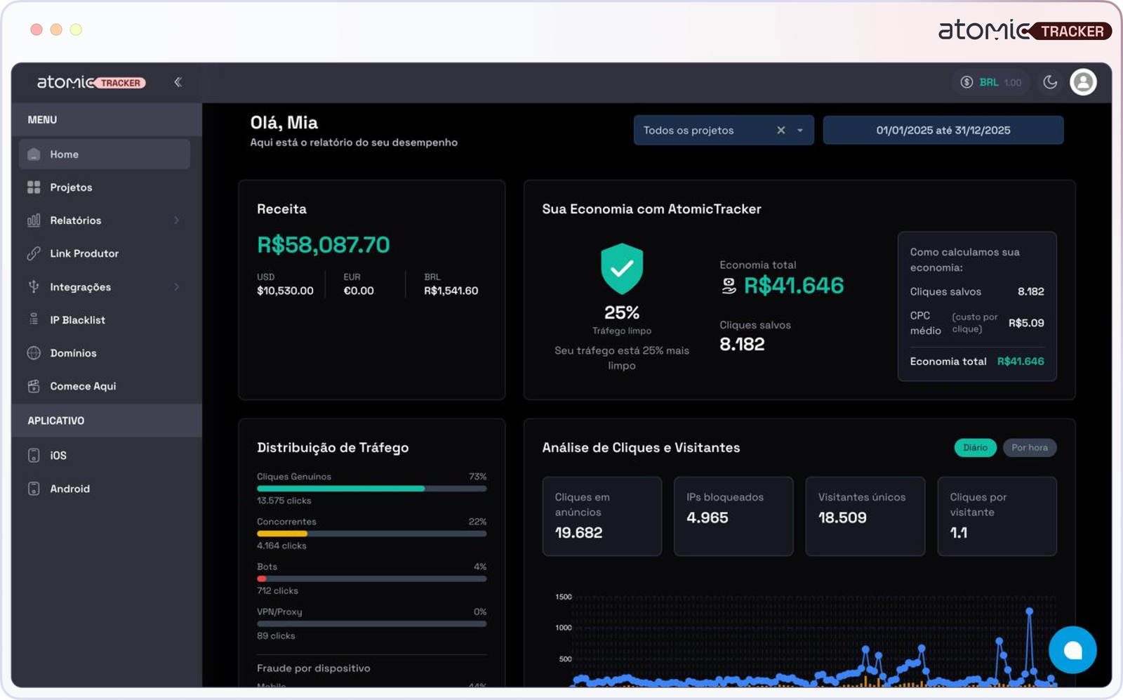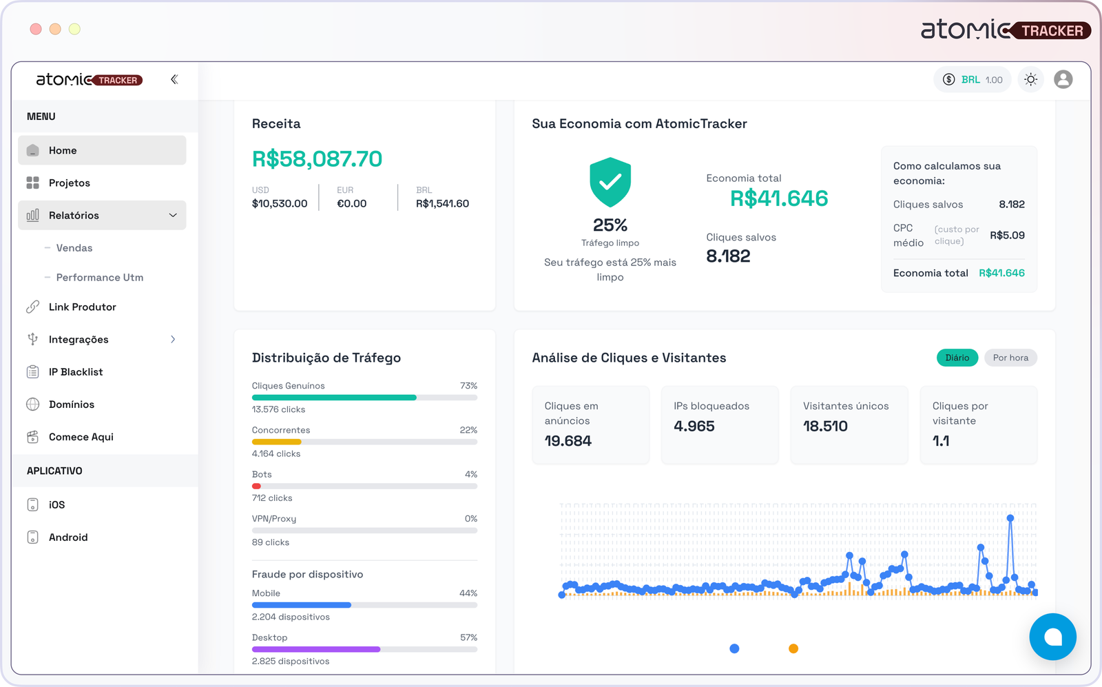 O AtomiTracker identifica e bloqueia cliques falsos, em tempo real, e rastreia todas as suas vendas (resolvendo a perda de dados do iOS e outras fontes), para que você possa escalar somente o que gera mais conversões.