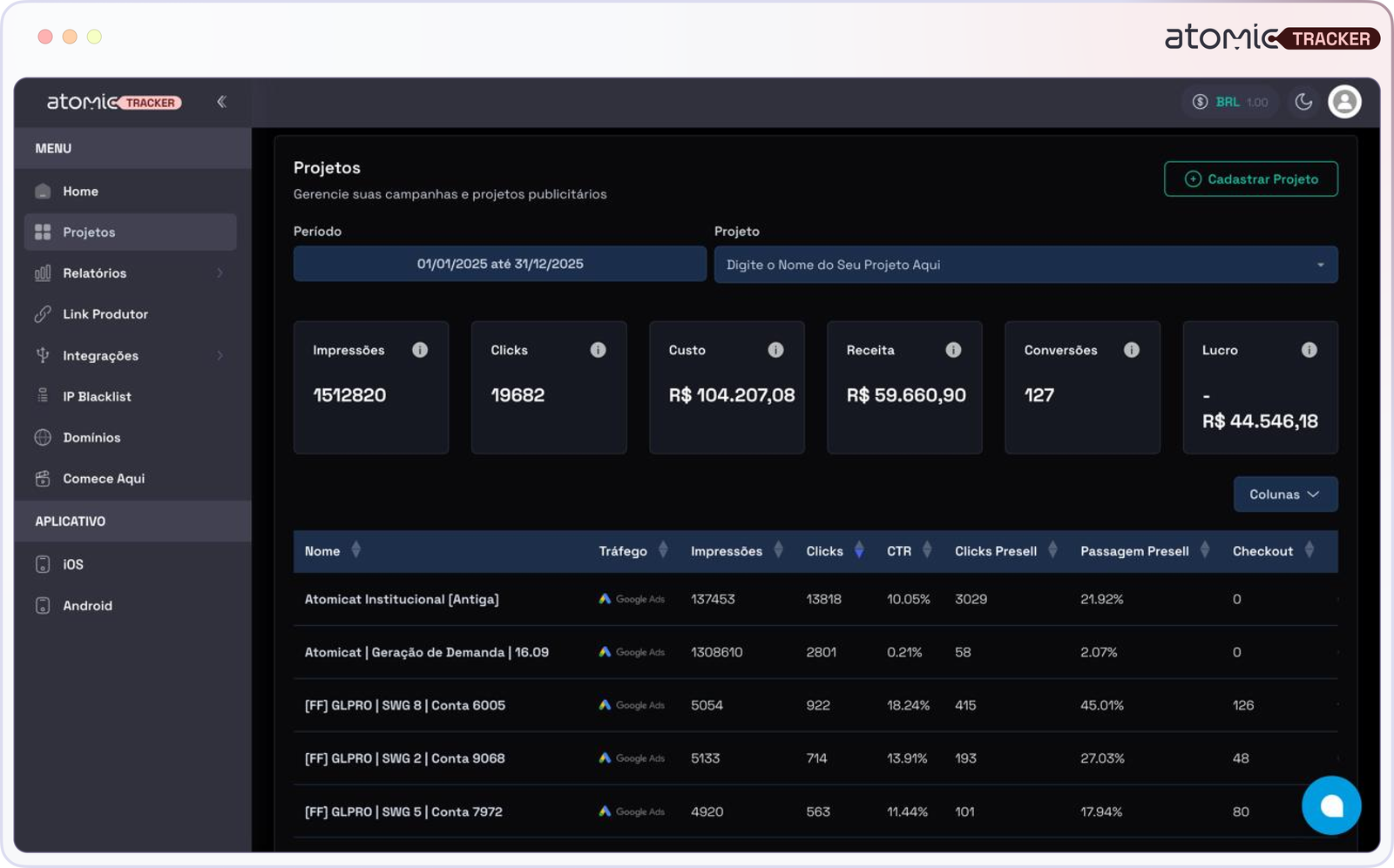 Acompanhe dados em tempo real, seu Custo por Clique (CPC) e Índice de Qualidade refletem a realidade, permitindo que você escale as campanhas que realmente funcionam.